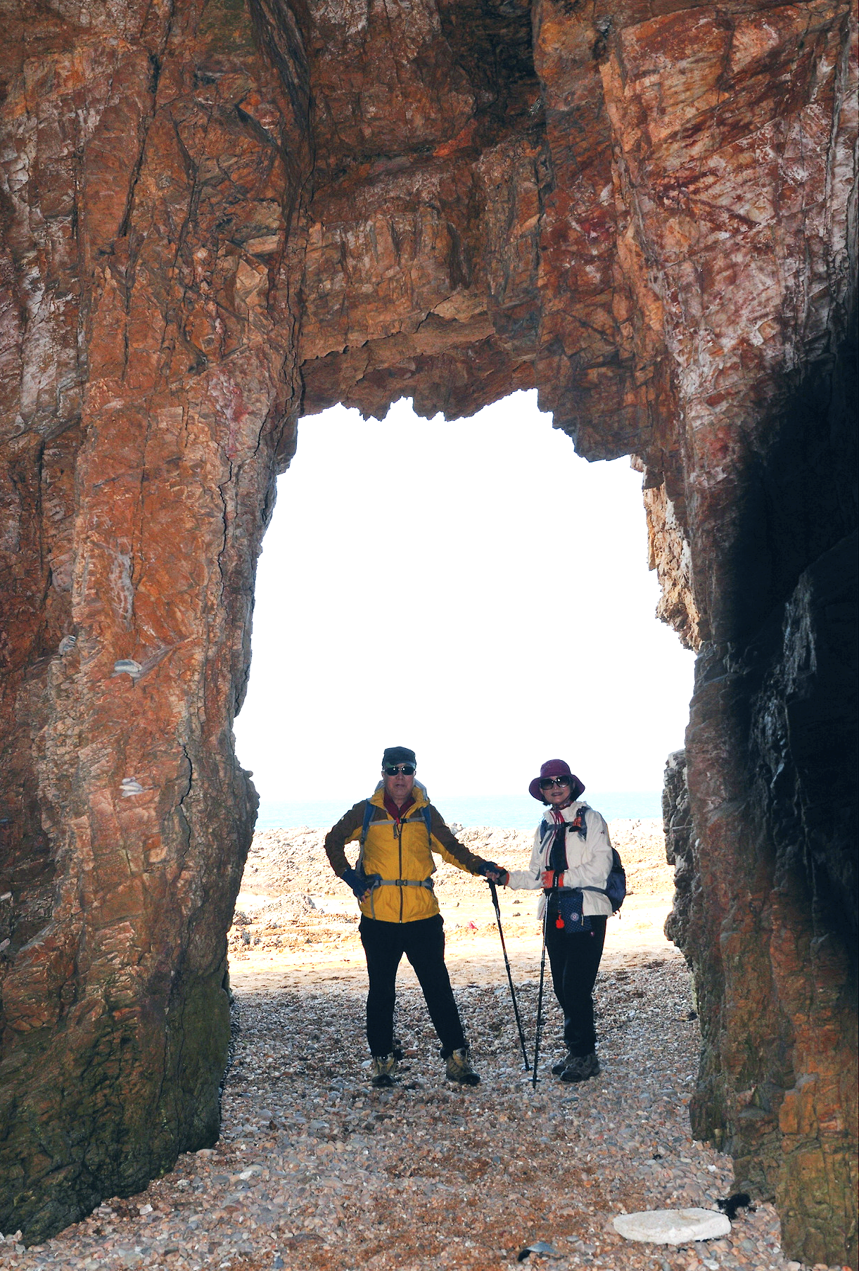 우리도 해식동굴 안에서 아치형 기둥과 멀리 보이는
